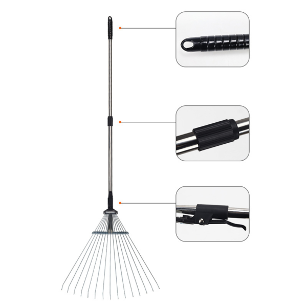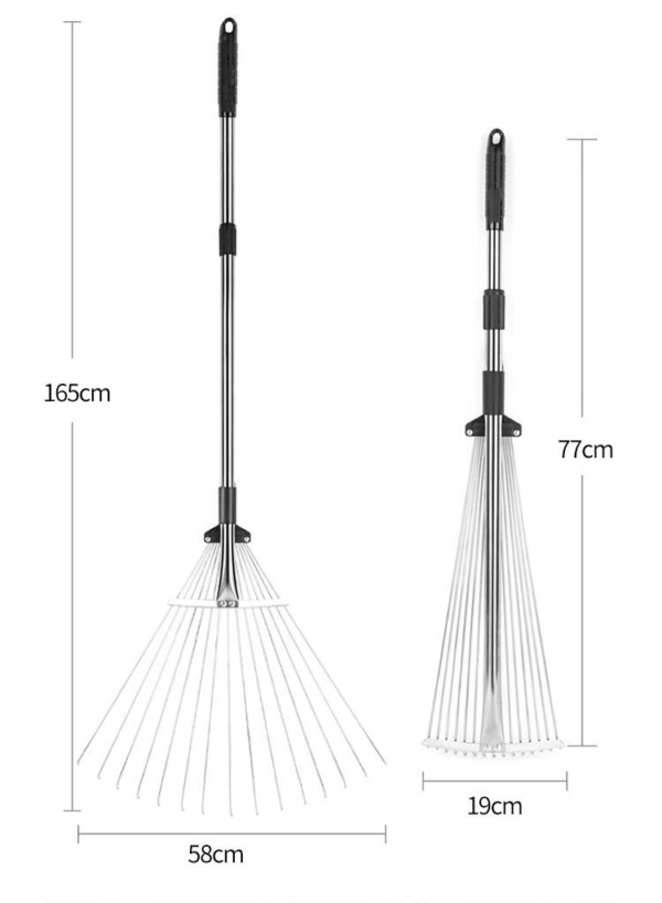Lightweight and durable steel garden rake designed for efficient lawn and yard maintenance. Features a strong steel handle and sturdy steel tines with 4 cm length for effective debris collection. Foldable design allows easy storage (120 × 19 cm folded) and expands to 159 × 63 cm for wider coverage. Weighing only 815 g, it is easy to handle, carry, and ideal for gardening, landscaping, and outdoor cleaning tasks.